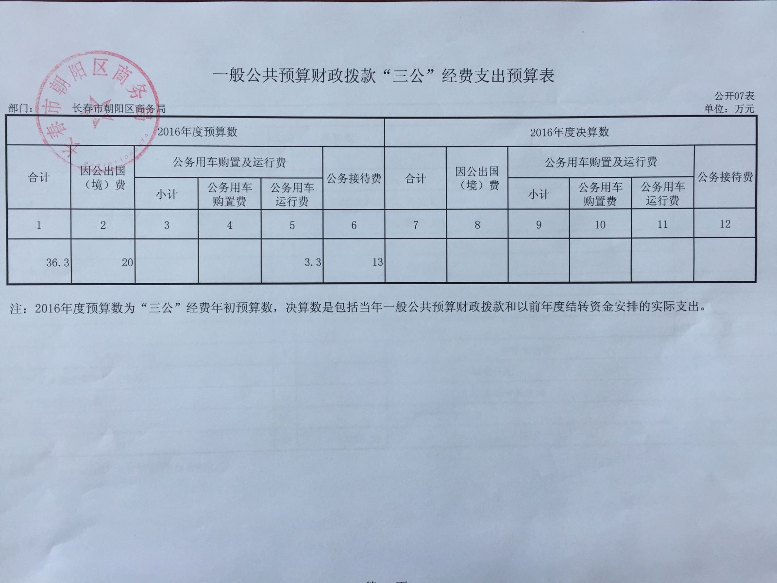 2016年三公经费预算总收支为36.3万元,其中因公出国(境)费20万元,公务用车运行费3.3万元,公务接待费13万元。