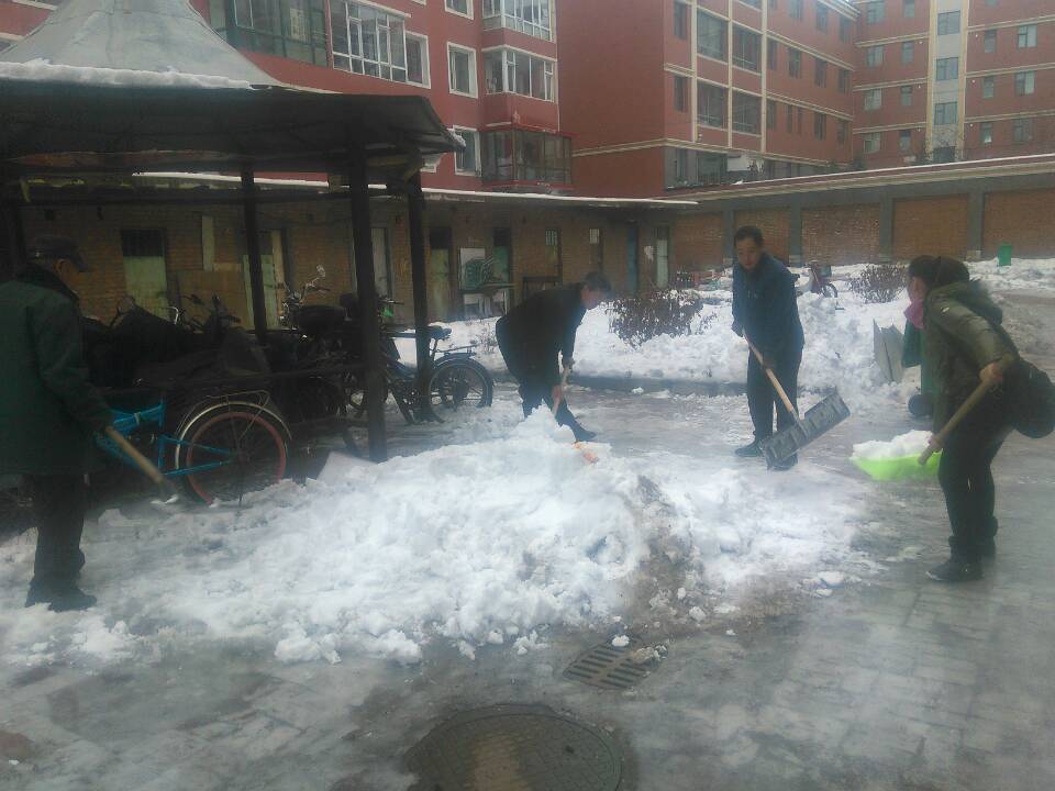 在党员义工的带领下,社区居民及工作者也积极行动起来,大家拿着除雪板、铁锨、扫帚,清理小区通道、人行道,经过1个小时的时间,将居民小区楼前积雪清扫干净,使居民有一个整洁、安全、畅通的出行环境。