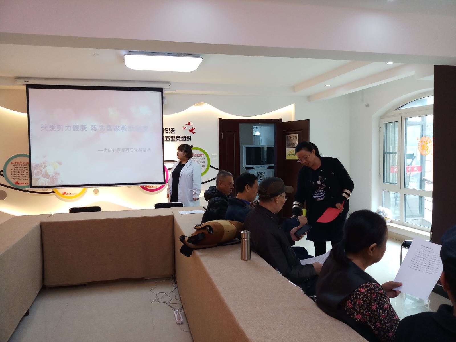 在爱耳日活动中,力旺社区还请来了社区卫生服务站的医务人员,为社区居民开展关爱听力健康知识讲座,为居民讲解爱耳护耳、听力筛查、康复等相关知识。活动中社区卫生服务站医务人员回答了居民们相关听力健康咨询,并为居民发放了宣传资料。