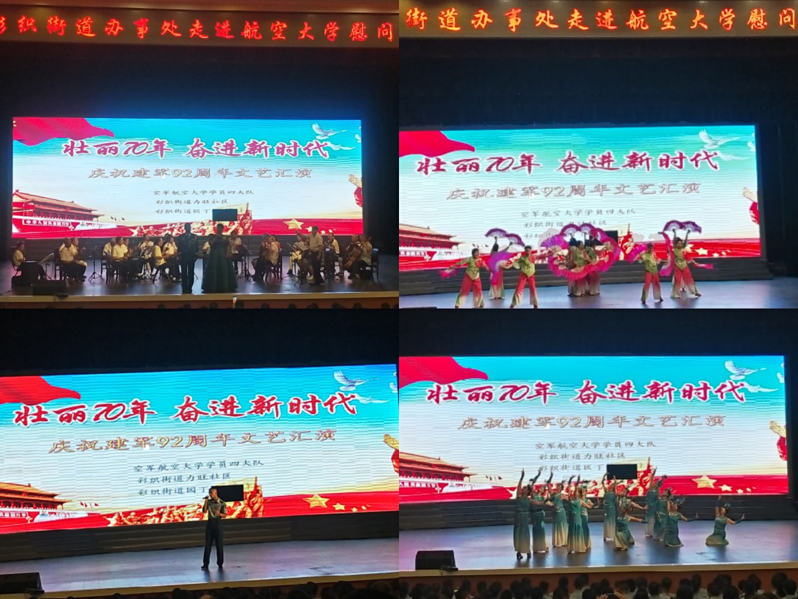 建军节来临之际,为热烈庆祝中国人民解放军建军92周年。由彩织街道力旺社区、园丁社区、航空航天大学四大队共同举办“壮丽70年 奋进新时代”专场联谊演出航空大学举行,航空大学两支学员队、彩织街道力旺、园丁艺术团叔叔阿姨们共500余人一起参加军地联谊文艺汇演。